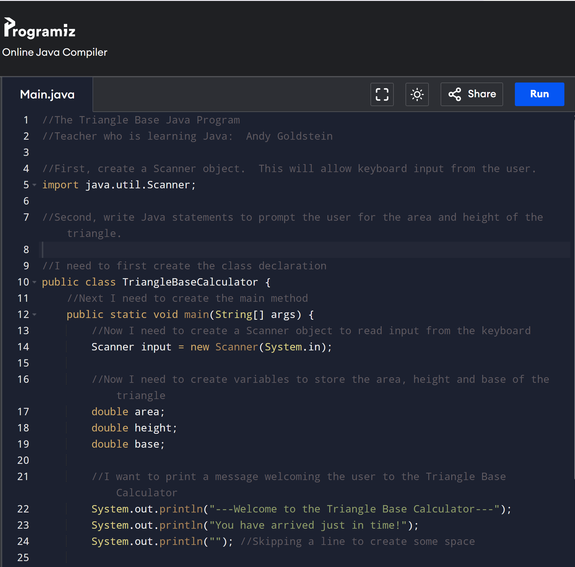 Mr. Goldstein is currently taking a workshop on Computer Science Principles A. This course takes place in the programming language of Java. Below is a Java program we made the calculates the base of a triangle when the user inputs the area and the height. Click anywhere on the code to get to the Java editor and compiler.