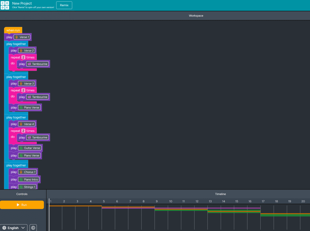 In Hour of Code, students can work in Music Jam, creating musical compositions with code. This music jam is by Simon S., Period 1.